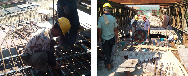 而各項(xiàng)工序的如期完工更離不開(kāi)施工一線的普通路橋建設(shè)者。記得前幾天下雨,他們依然在橋上綁扎鋼筋,立模板,雨實(shí)在太大了,他們就躲在橋下休息會(huì)等雨小了點(diǎn)再繼續(xù)工作,為的就是能完成節(jié)點(diǎn)目標(biāo),從而保證最終工期。今天早上張拉豎向筋,一大早氣溫就有三十幾度了,四五個(gè)工人抬著油頂,汗順著臉頰留下來(lái),衣服都濕透了,汗水順著衣角流下來(lái)。然而工作未完成誰(shuí)都不肯休息,黝黑的臉上一笑就看到白白的牙齒。這就是我們可愛(ài)的工人,即使再苦再累他們也要把活干好,也要實(shí)現(xiàn)工期指標(biāo)。當(dāng)然項(xiàng)目部人員也沒(méi)閑著,給工人進(jìn)行高溫施工的安全培訓(xùn),合理安排作息時(shí)間,進(jìn)行錯(cuò)時(shí)作業(yè),避免高溫施工;進(jìn)行演練,并且做好防高溫后勤保障工作,備齊充足的飲用水、綠豆湯,為施工人員發(fā)放防暑降溫物品和藥品,盡量為施工人員提供良好的休息環(huán)境。